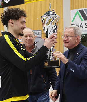[Friedhelm Julius Beucher, Ehrenvorsitzender des Deutschen Behindertensportverbandes aus Bergneustadt und Stammgast beim Budenzauber, überreichte den neuen Siegerpokal – den alten durfte Nümbrecht nach drei Erfolgen hintereinander behalten – an Hohkeppels Dominik Bilogrevic.]